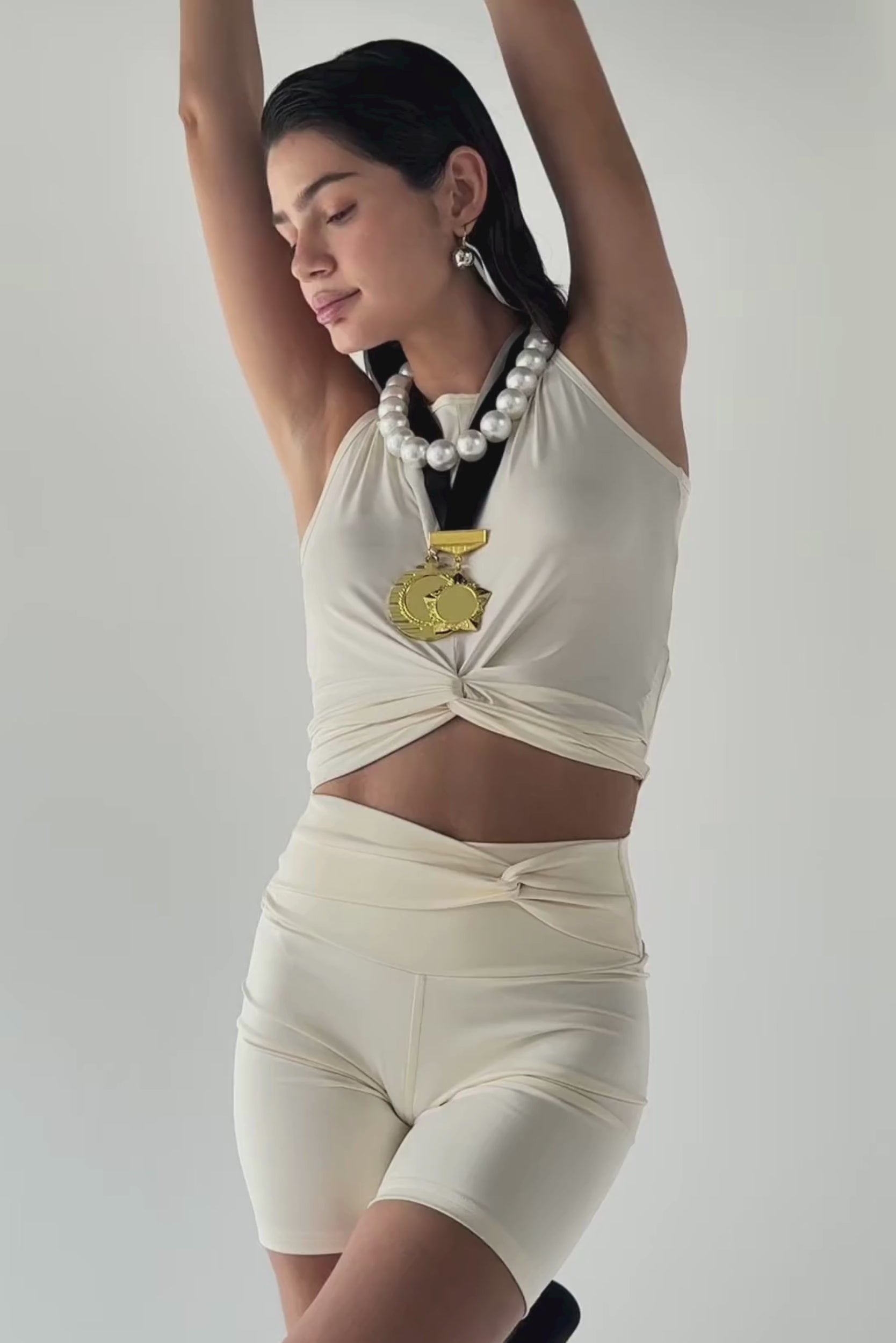 Nuestra modelo de fotos fondo blanco usa una talla Small arriba y abajo. Altura: 176 cm. Busto: 82 cm. Cintura: 61 cm. Caderas: 92 cm.